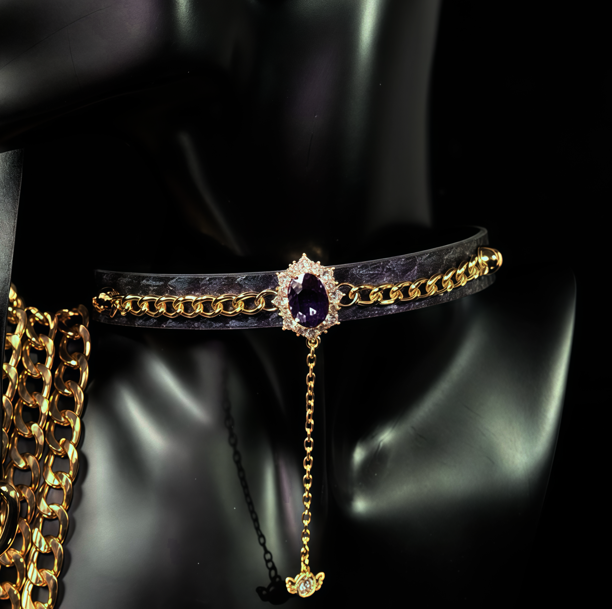 A luxurious leather choker accented with a gemstone centerpiece and gold chain — refined, powerful, and unapologetically bold.