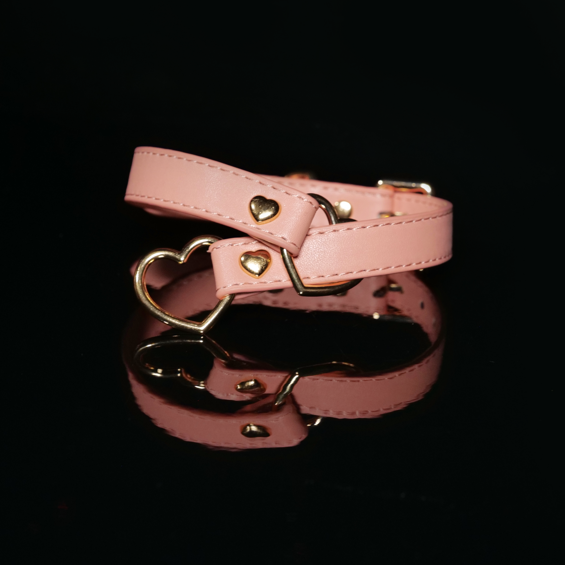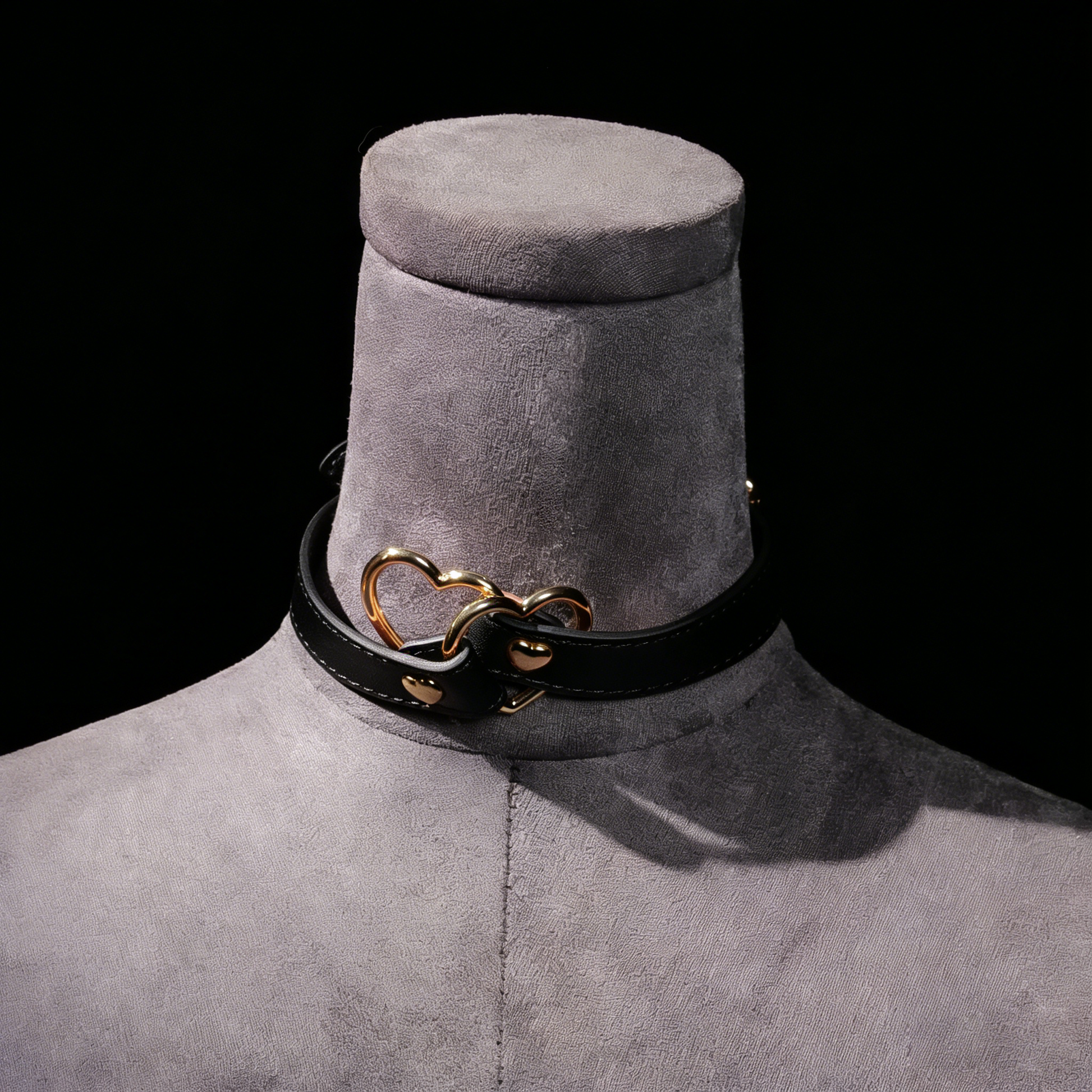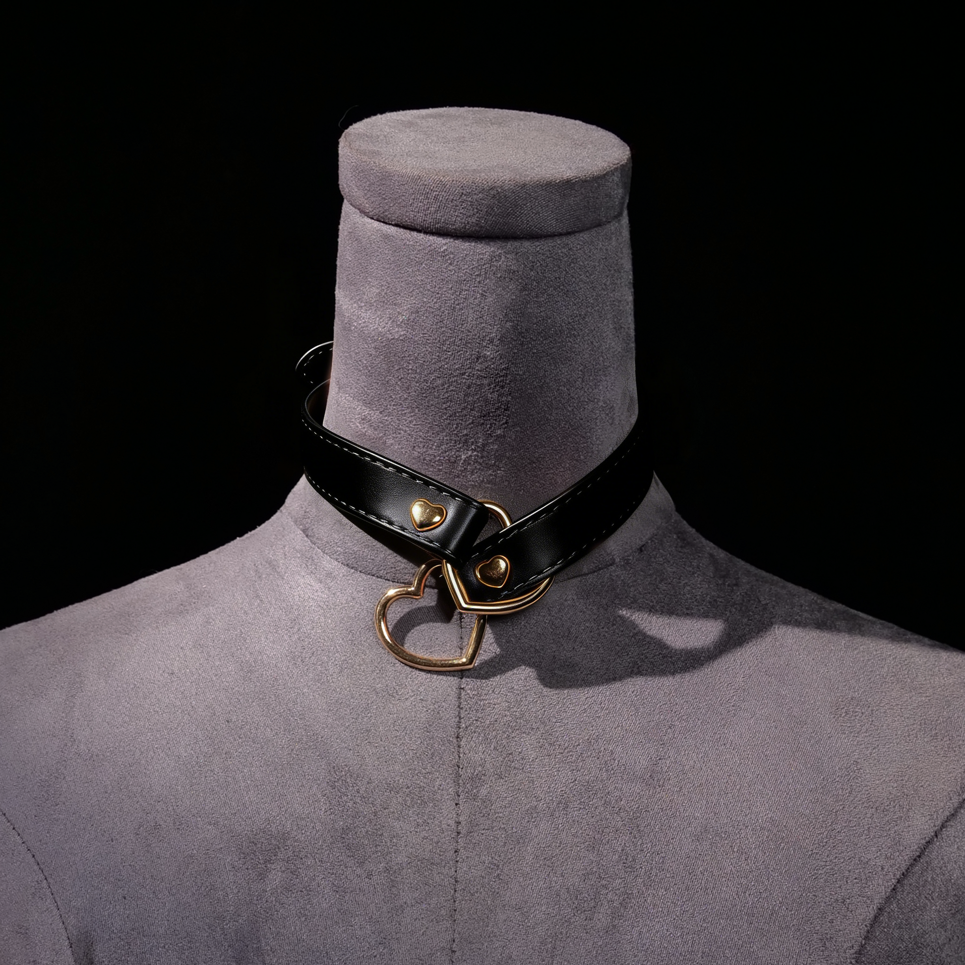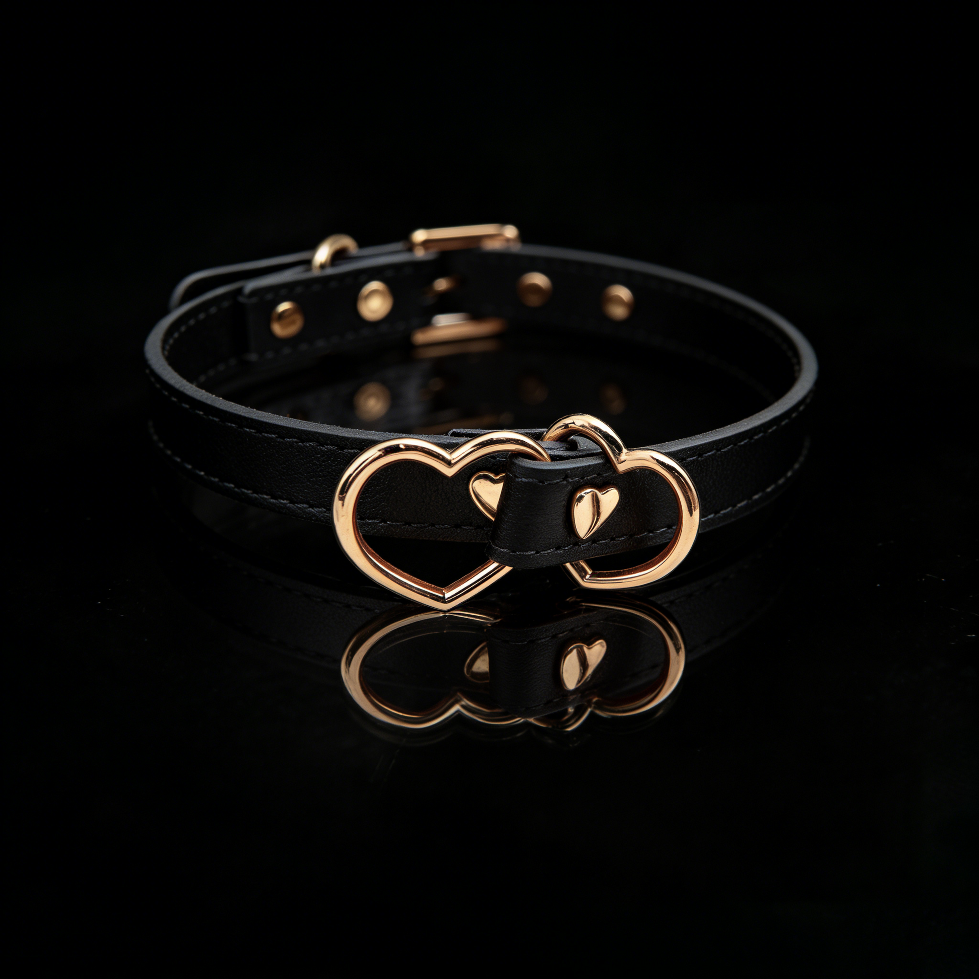 A sleek leather choker accented with heart-shaped rings — soft in detail, bold in attitude.